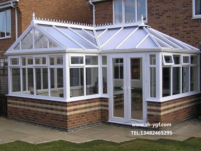上海松江某別墅陽(yáng)光房頂面造型裝飾花,頂部采用明框幕墻料,5+0.76—+5mm夾膠雙鋼化安全玻璃,pvc皇家天溝落水系統(tǒng),立面采用5+9A+5mm中空雙鋼化玻璃,55系列上旋窗和平開(kāi)門(mén),香港立興配件