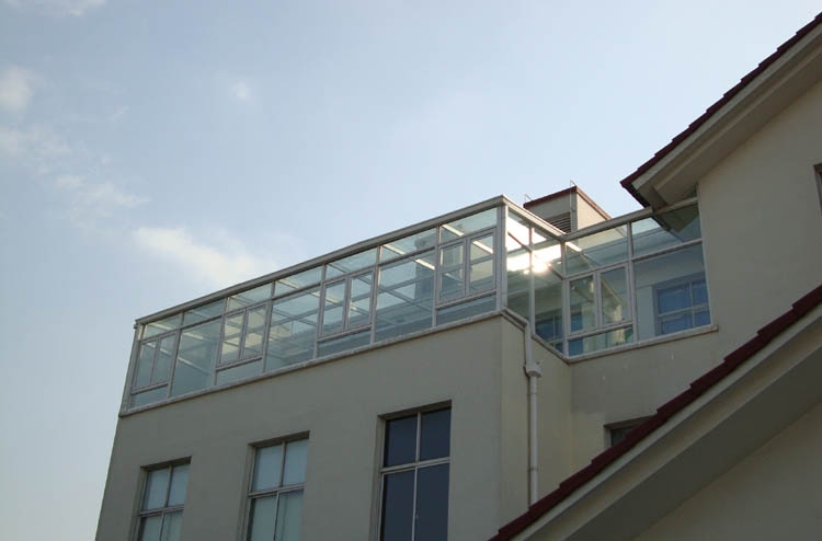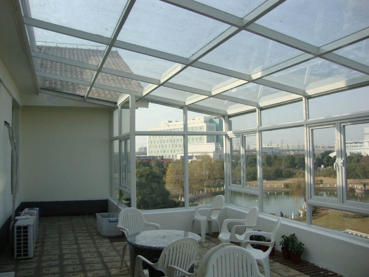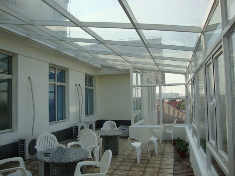 頂面采用5+0.76+5mm夾膠雙鋼化玻璃,立面為50系列外平開窗,中空雙鋼化玻璃