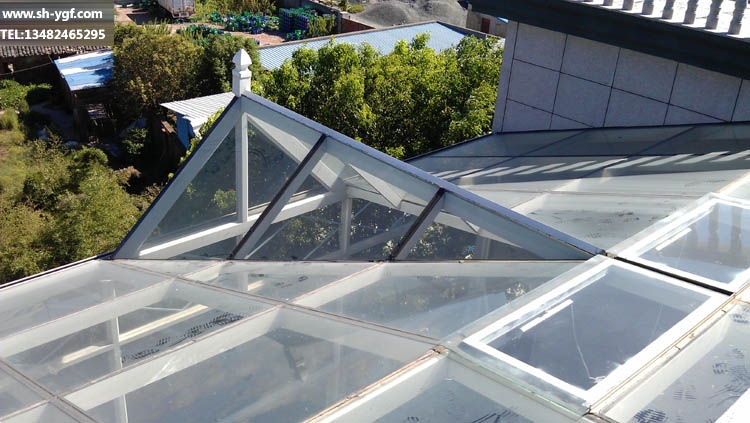 頂面為斜坡+人字頂組合造型,主梁采用50*100*4.5mm;40*80*3.0mm鋼骨架焊接,外包鋁合金裝飾,夾膠雙鋼化玻璃