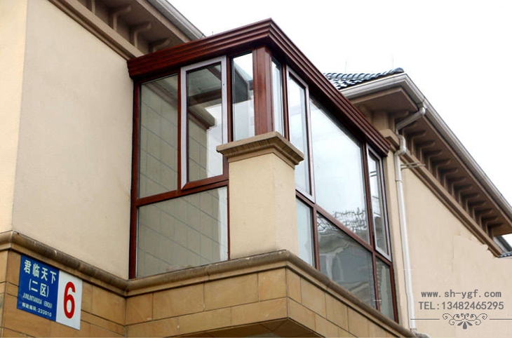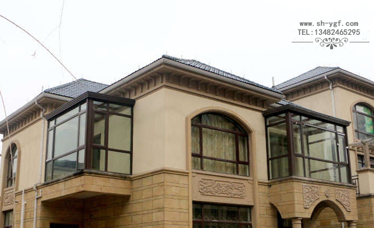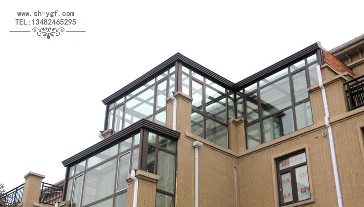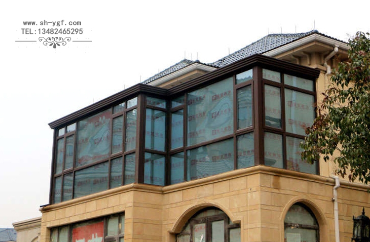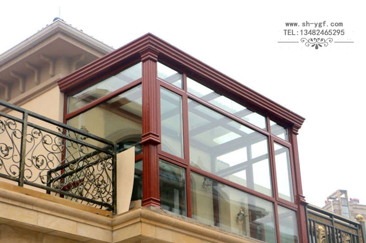 羅馬柱平頂陽光房,陽光房骨架采用羅馬柱式鋁合金材料,陽光房檐口采用鋁合金系統裝飾天溝,陽光房整體風格大氣沉穩